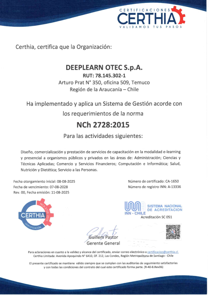 DeepLearn Academy (Razon Social Deeplearn OTEC S.p.A) ha sido certificada bajo la norma NCh 2728:2015, cumpliendo con los estándares exigidos por el Sistema Nacional de Acreditación de Chile (INN).